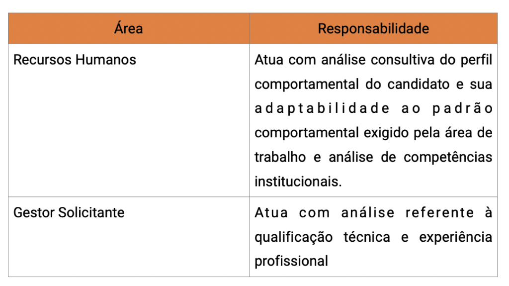 A responsabilidade pelo processo seletivo é da área de Recursos Humanos, sendo compartilhada com a gestão da área requisitante critérios técnicos e comportamentais desejados.
